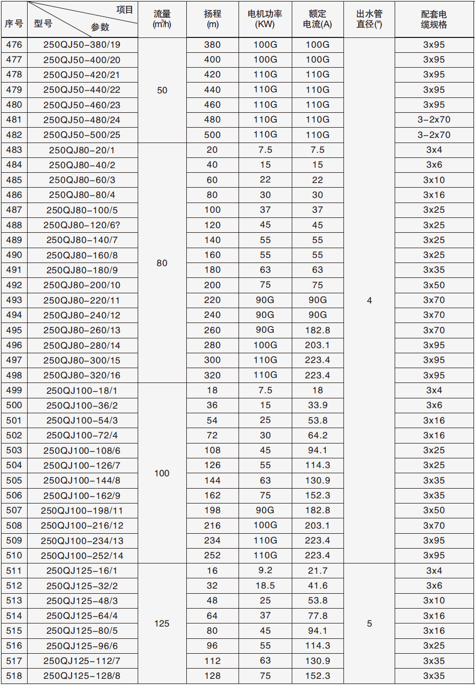 QJ(R)型潜水电泵的产品部分参数(见附表 )